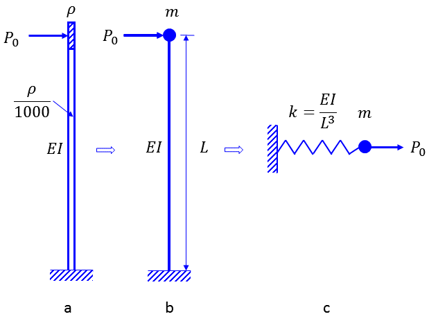 A cantilever beam is placed vertically (See Figure 1). At the beam top, the density is much bigger than elsewhere on the beam (Figure 1a). A horizontal force \(P_0 = k U_0\) is applied at the top mass centroid to ensure a static horizontal displacement of 0.001 at the beam top. The force is then released to let the beam vibrate. The model schematically shown in Figure 1a can be simplified into Figure 1b with a lumped mass \(m\) at the beam top. It can be further idealized as a single degree-of-freedom vibration system shown in Figure 1c, with a mass \(m\) and a stiffness \(k=EI/L^3\). The damping coefficient \(c\) will be assumed with various values. The FLAC3D model is based on Figure 1a using beam elements, and the FLAC3D solution will be compared with the analytical solution based on Figure 1c.