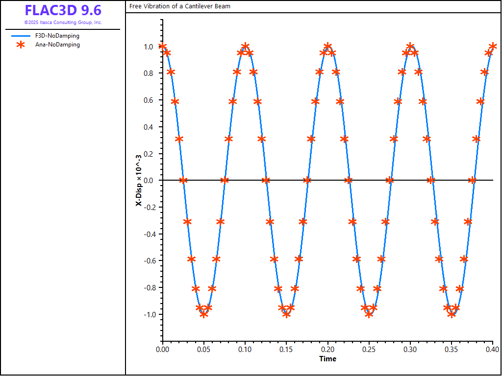 Figure 3: FLAC3D and analytical solution—no-damping (\(\alpha\) = 0 or \(\zeta\) = 0%).