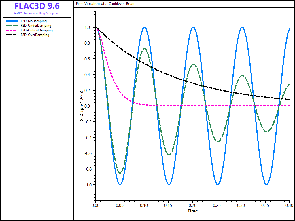 In the FLAC3D model, the beam is divided into 10 beam elements. A static horizontal force \(P_0\) is applied at the centroid of the lumped mass. After equilibrium is reached, the static displacement should be \(U_0 = P_0/k = 0.001\). The force is then released to let the cantilever beam freely vibrate at four different damping ratios, \(\zeta\) = 0%, 5%, 100%, and 500%, or \(\alpha\) = 0, \(2\pi\), \(40\pi\), and \(200\pi\) (since \(T_n\) = 0.1), to represent four cases, namely, no-, under-, critical-, and over-damping.