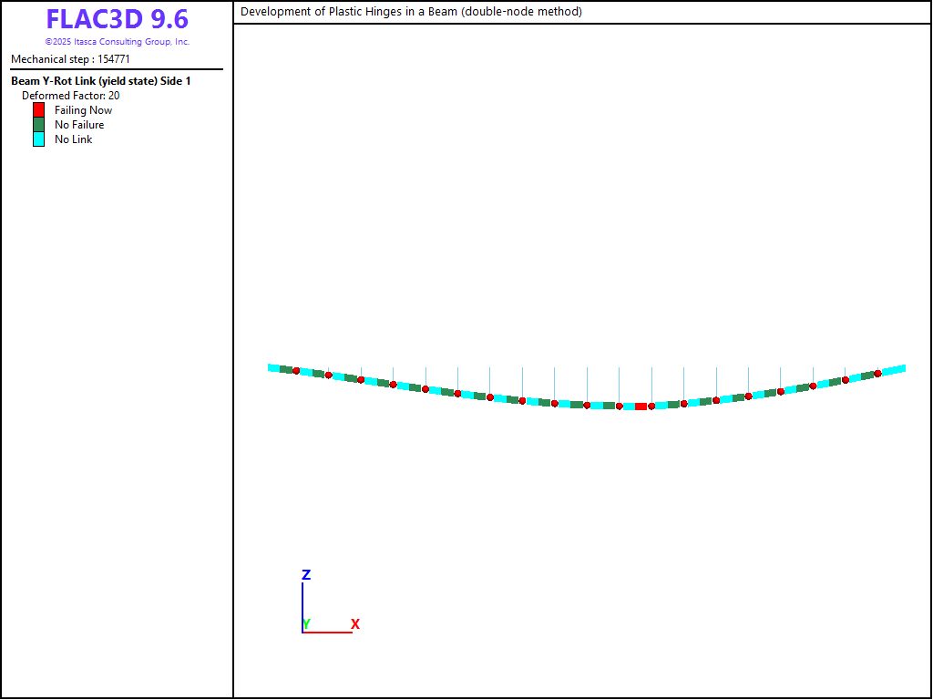 For both the single- and double-node methods, a kinematic mechanism develops for a load of 5.85 MN/m. The last stable case is for a load of 5.80 MN/m. These results bound the value of 5.83 MN/m from the analytical solution. The bending-moment and shear-force distributions before collapse are contained in the “doublenode_580” save file, and are shown in Figures 4 and 5. The location of the failed hinge can be seen by plotting the link yield state indicators of the \(y\)-rotation degree-of-freedom as shown in Figure 6. Because only one node of each node pair has a link, the side of the element connected to the other node will display the “No Link” state. The plastic hinge develops at link 12 (with link numbering starting at 1 on the left end of the beam). Each element has a length 0.5 m; thus, the failed link is located at a distance of 6 m from the left end. This agrees well with the analytical solution of 5.86 m. The plastic hinge for the single-node model can be observed by plotting the deformed shape in Figure 7, and noting that the bending-moment magnitude at the plastic hinge location is \(50 \textrm{ MN}\,\textrm{m}\).