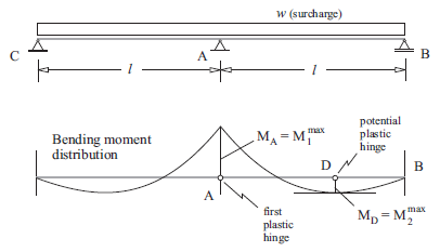 Consider a gradually increasing surcharge, \(w\), acting on the beam. If the maximum plastic moment that the beam supports is \(M^{pl}\), the first plastic hinge will develop at the point where \(M^{pl}\) is reached first (i.e., at point \(A\)). After the first hinge has formed, the problem is still stable. The system behaves as two separate beams with a constant bending moment \(M^{pl}\) at point \(A\). Collapse of the system will occur when a second hinge develops (i.e., at point \(D\) where the second maximum bending moment occurs). This is because a second hinge at position \(D\) creates a kinematic mechanism.