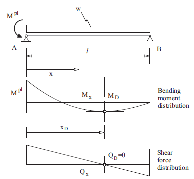 The location of the point \(D\) in Figure 1, where the second plastic hinge develops, can be found from simple beam theory analysis as described here. Consider the simply supported beam shown in Figure 2. This represents the situation after the first plastic hinge has developed at the midpoint in Figure 1. The bending moment at point \(A\) is constant and equal to \(M^{pl}\). Figure 2 also illustrates the distribution of bending moments \(M(x)\) and shear force \(Q(x)\) along the right span of the beam. The objective, then, is to find the coordinate, \(x_D\), of the maximum bending moment where the second plastic hinge that produces collapse will develop.