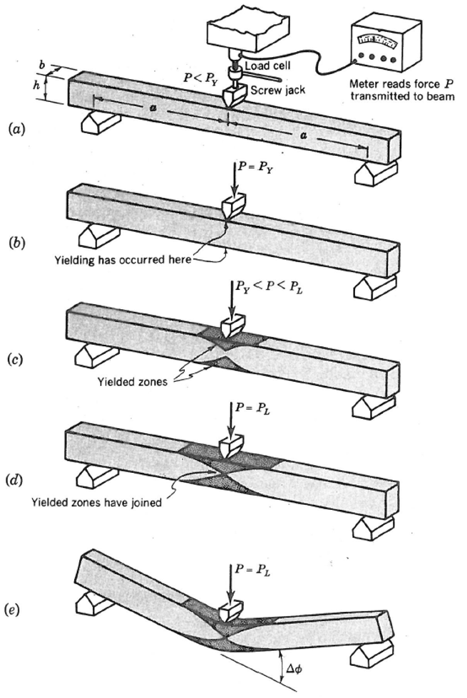 The creation of a plastic hinge in a rectangular beam of elastic-perfectly plastic material is described by Crandall et al. (1978) and sketched in image (a) of Figure 1. The maximum bending moment is at the beam center. At first the behavior is elastic, and the force \(P\) increases in linear proportion to the central deflection. In image (b) the point has been reached where the central bending moment is \(M_y\), and yielding begins at the top and bottom of the cross section. As the beam is deflected further, two zones of yielded material begin to grow, as shown in image (c). These zones extend from the center where the bending moment is greater than \(M_y\) out to the points where the bending moment is just equal to \(M_y\). The force \(P\) continues to grow during this stage of the deflection but at a less rapid rate than when the beam was entirely elastic. The yielded zones continue to grow as the screw jack is advanced until the configuration of image (d) is reached. At this point the yielded zones just touch at the center of the beam. The bending moment there is \(M_p\). Although the curvature at the central point is now infinite, the slope is still finite and continuous and so is the deflection. Since the central cross section is now completely plastic, any further motion of the screw jack can be accommodated by plastic flow at the center without any additional deformation of the rest of the beam and without further increase in the force \(P\). Thus further deflection of the beam results in a finite discontinuity in slope at the center as shown in image (e), and the beam collapses. This localized deformation is called a plastic hinge.