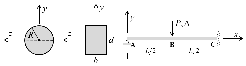 where \(P\) is applied load; \(E\) is Young’s modulus; \(I_z\) is moment of inertia with respect to \(z\) axis; \(L\) is beam length; \(b\) and \(d\) are width and depth, respectively, of the rectangular cross section, and \(R\) is radius of the circular cross section.