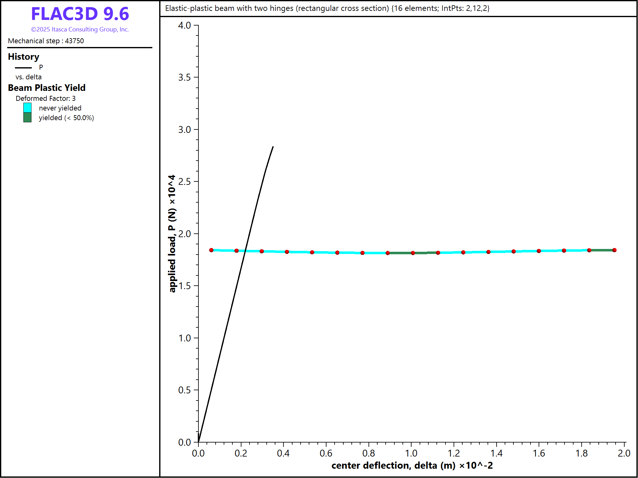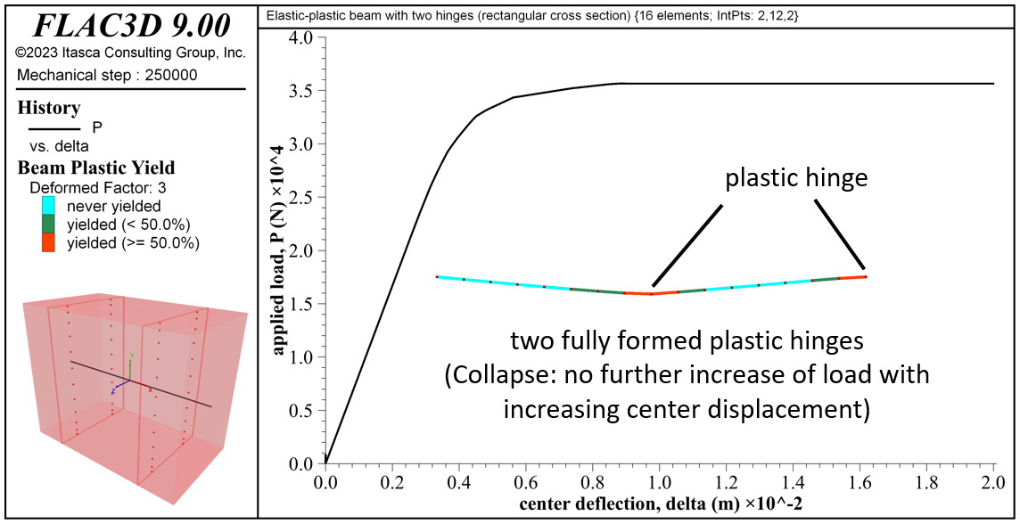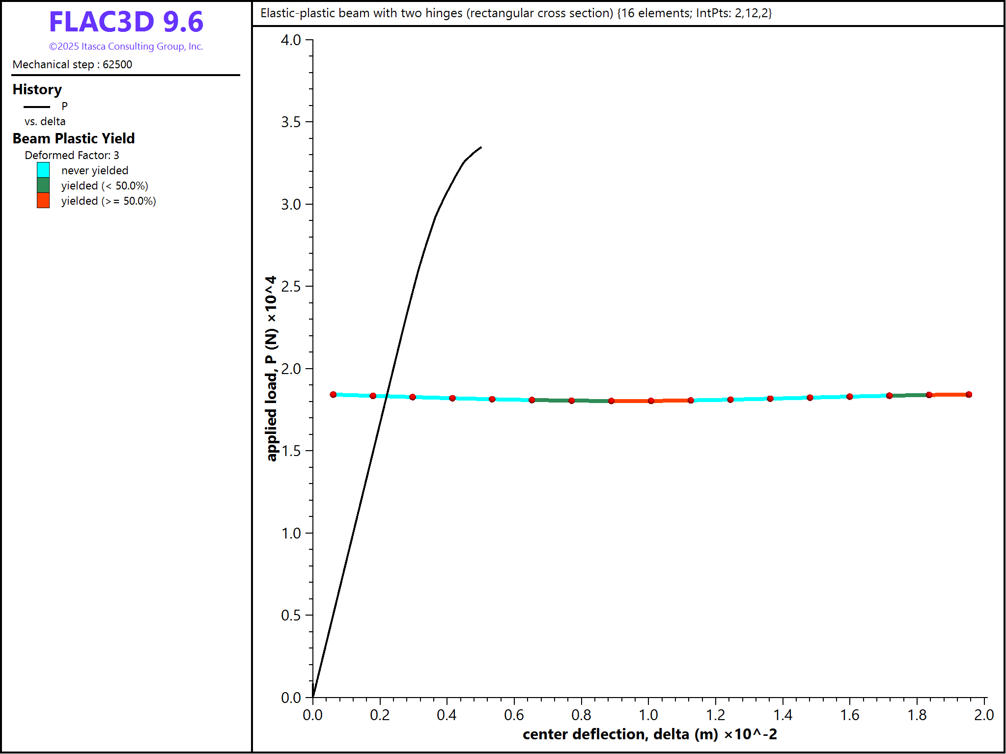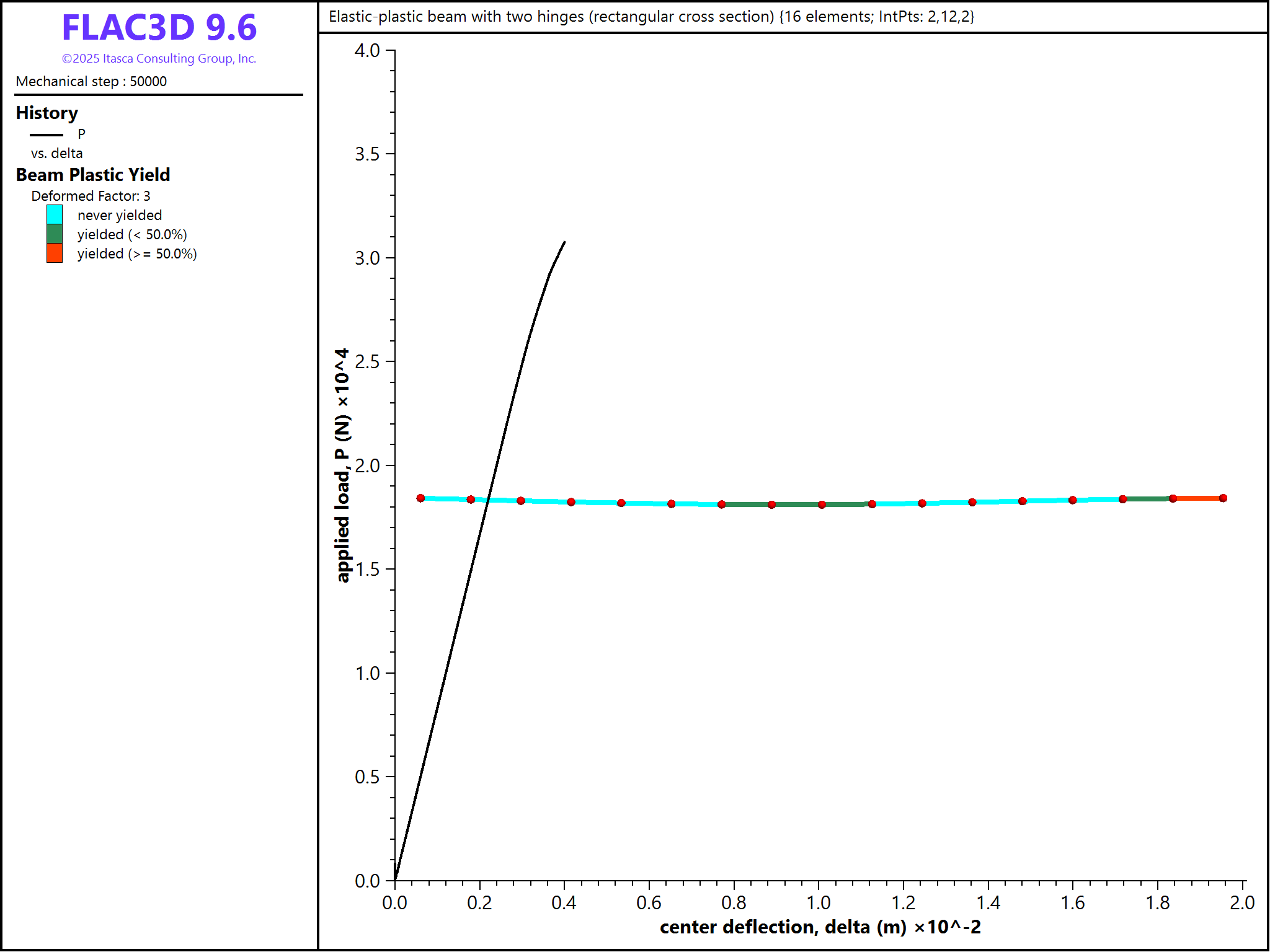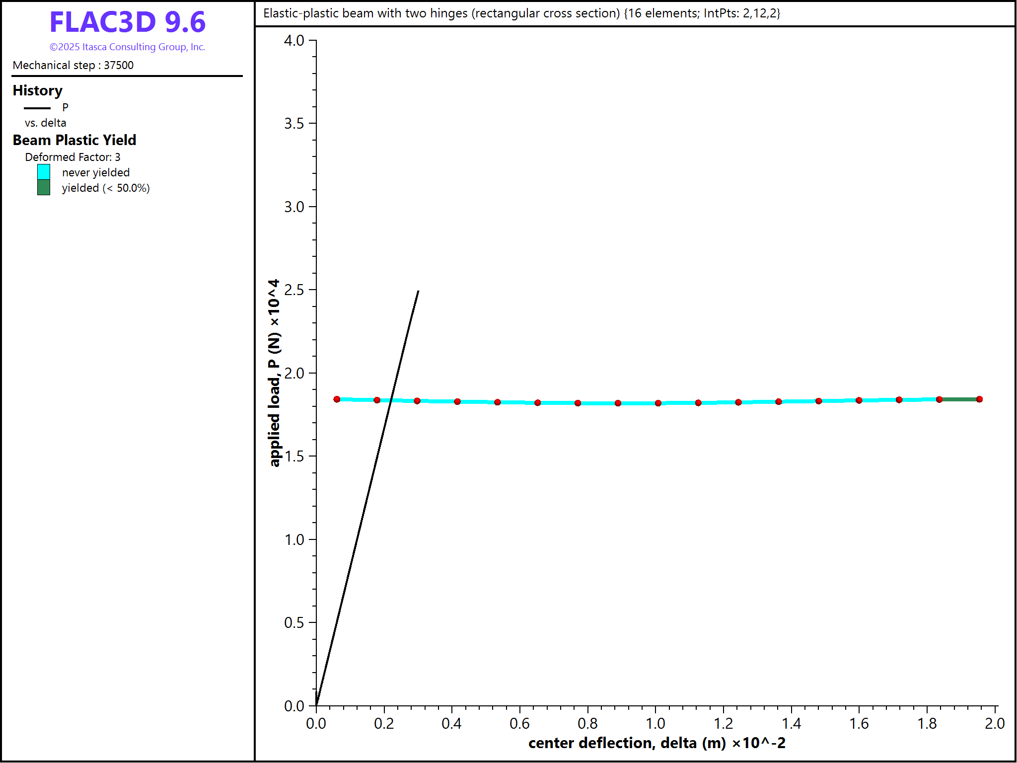 The response for the beam of rectangular cross section matches the response of the analytical model (see Figure 8).[2] The collapse load of 35653 N is within 4.2 percent of the analytical value. Hinges have formed at the center and right end. The center hinge has formed because all integration points on the plane of integration points on the right side of the element just to the left of center have yielded. The right-end hinge has formed because all integration points on the plane of integration points on the right side of the rightmost element have yielded.