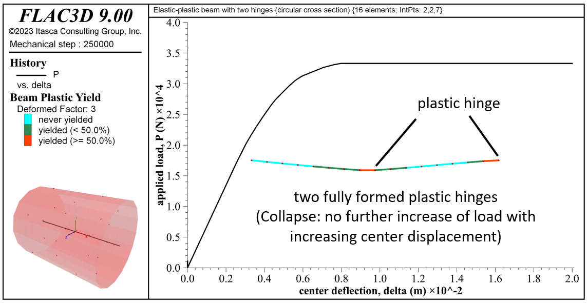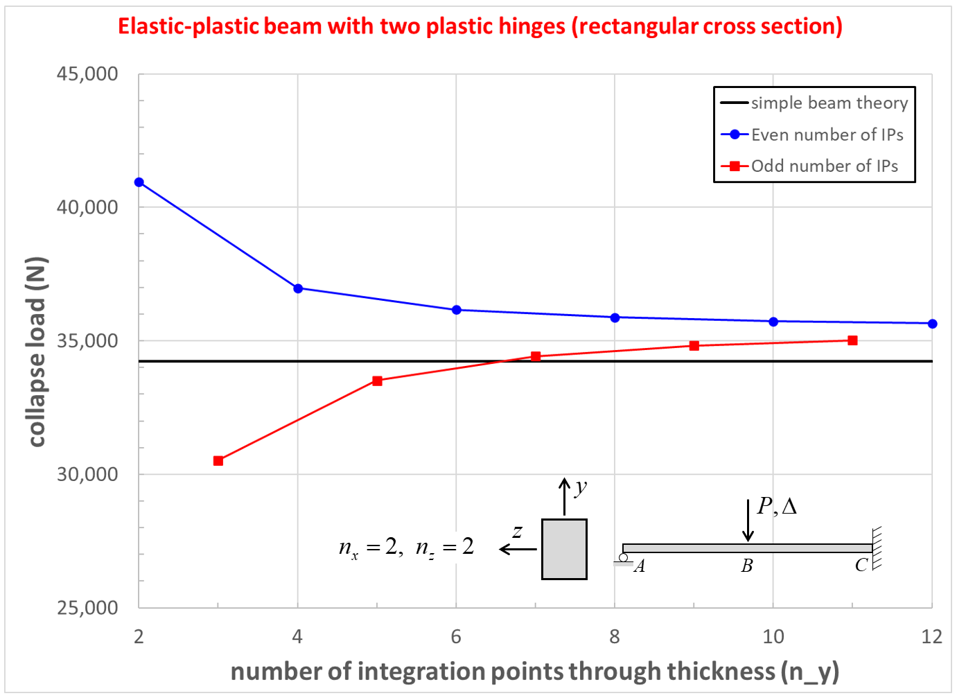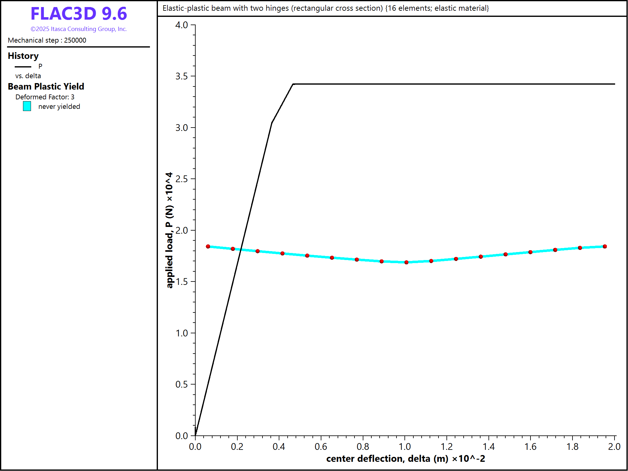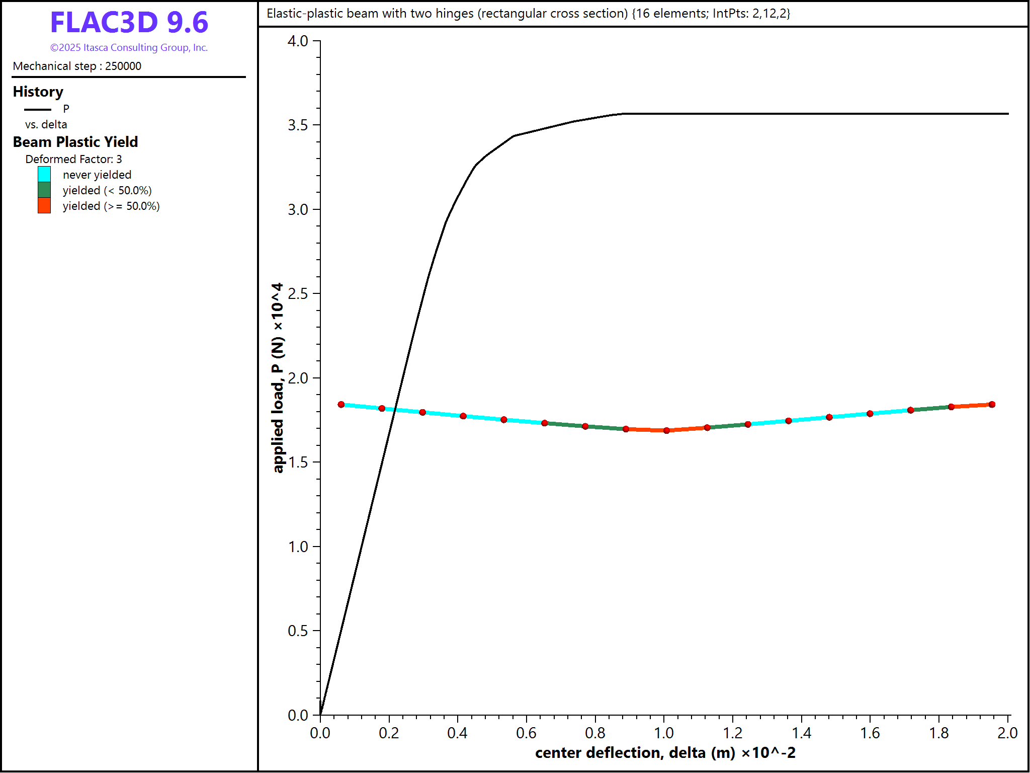 The response for the beam of rectangular cross section matches the response of the analytical model (see Figure 8).[2] The collapse load of 35653 N is within 4.2 percent of the analytical value. Hinges have formed at the center and right end. The center hinge has formed because all integration points on the plane of integration points on the right side of the element just to the left of center have yielded. The right-end hinge has formed because all integration points on the plane of integration points on the right side of the rightmost element have yielded.