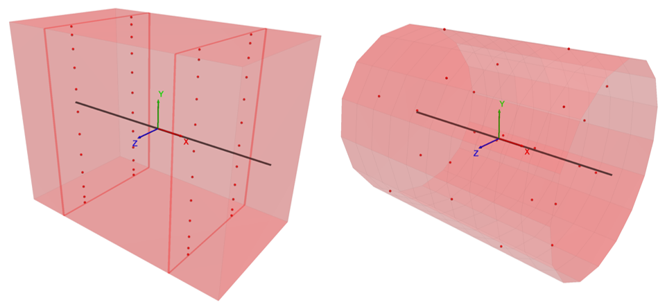 Figure 4: Integration points in a beam element with rectangular (left) and circular (right) cross section.