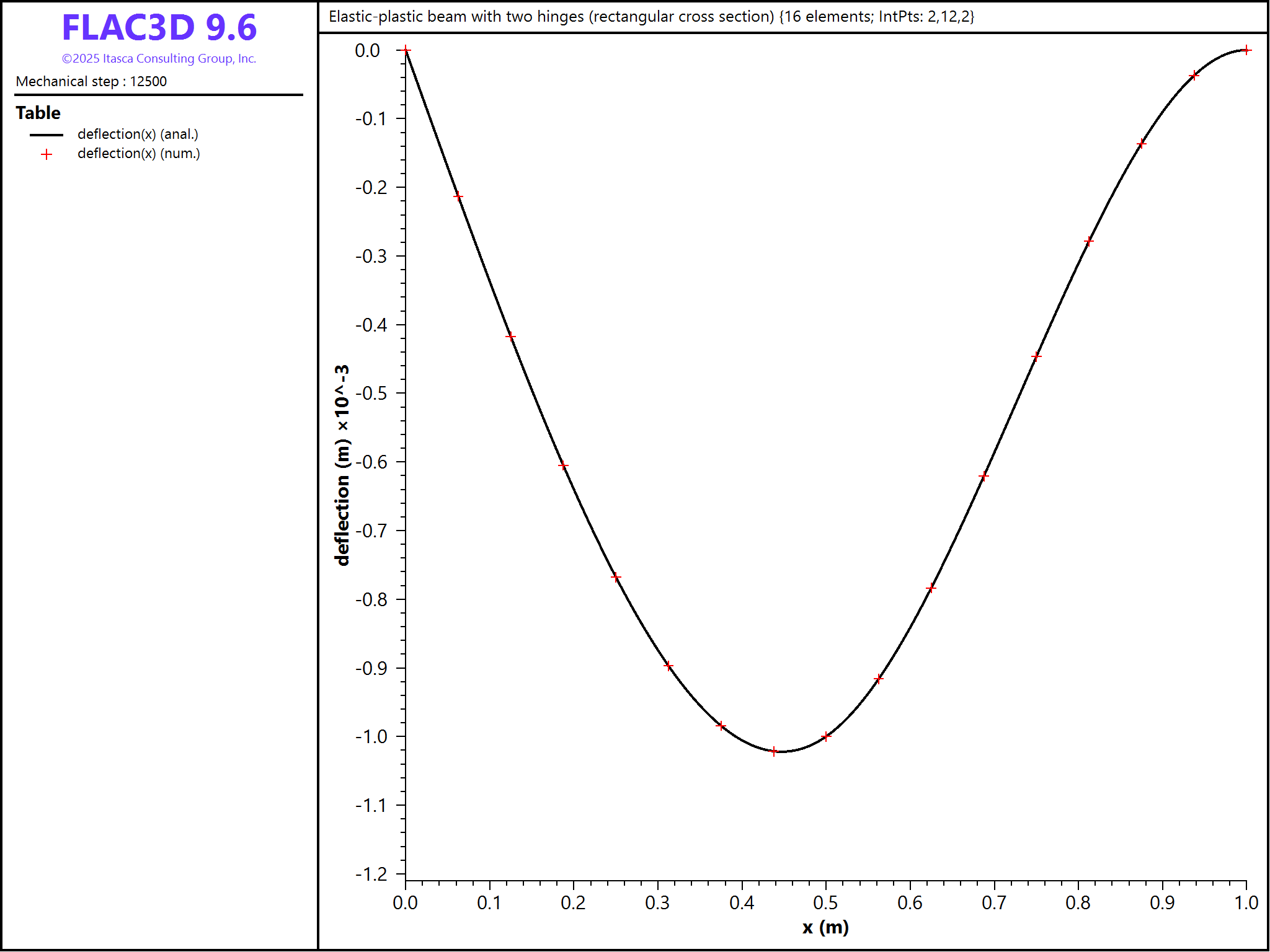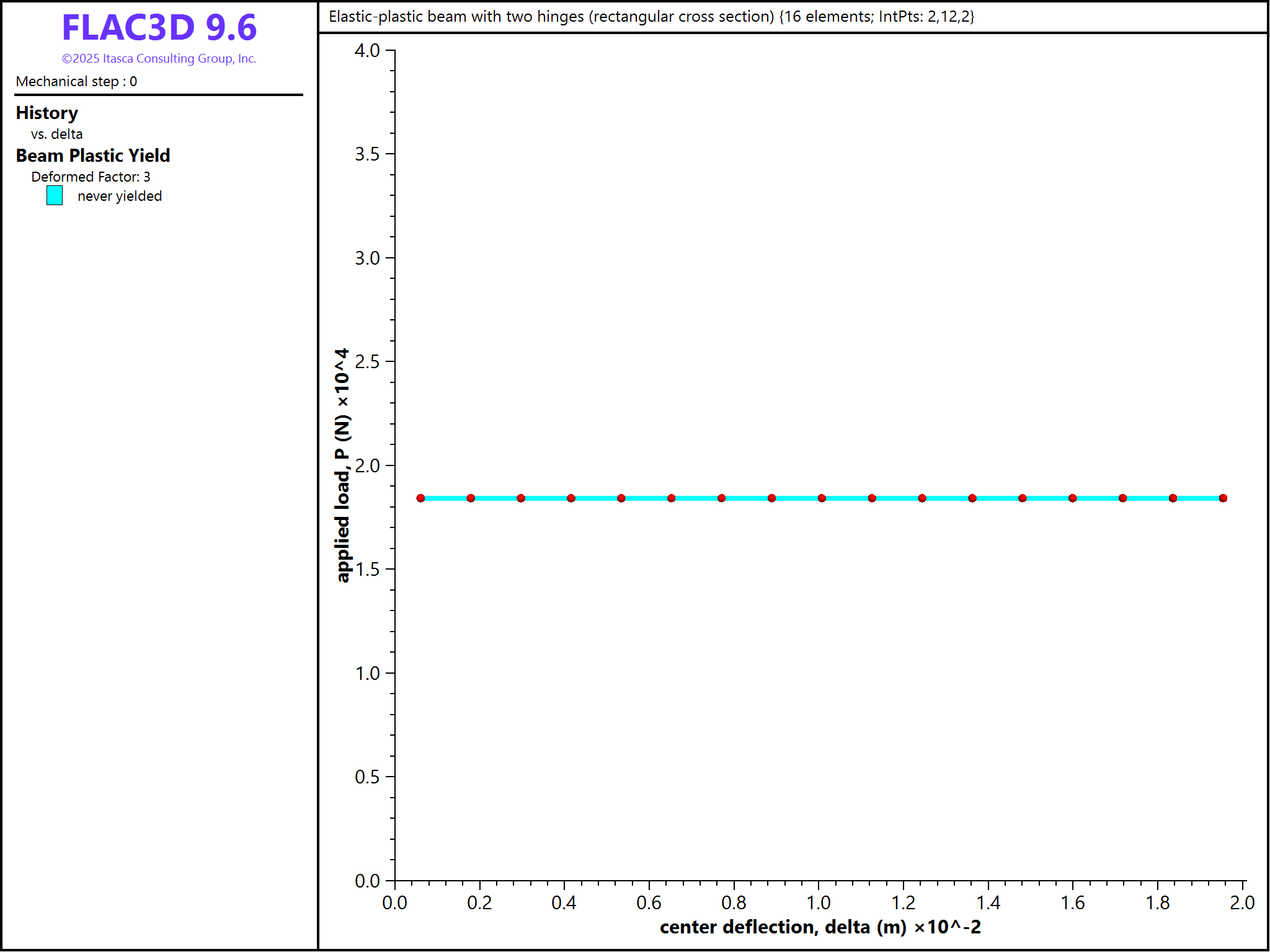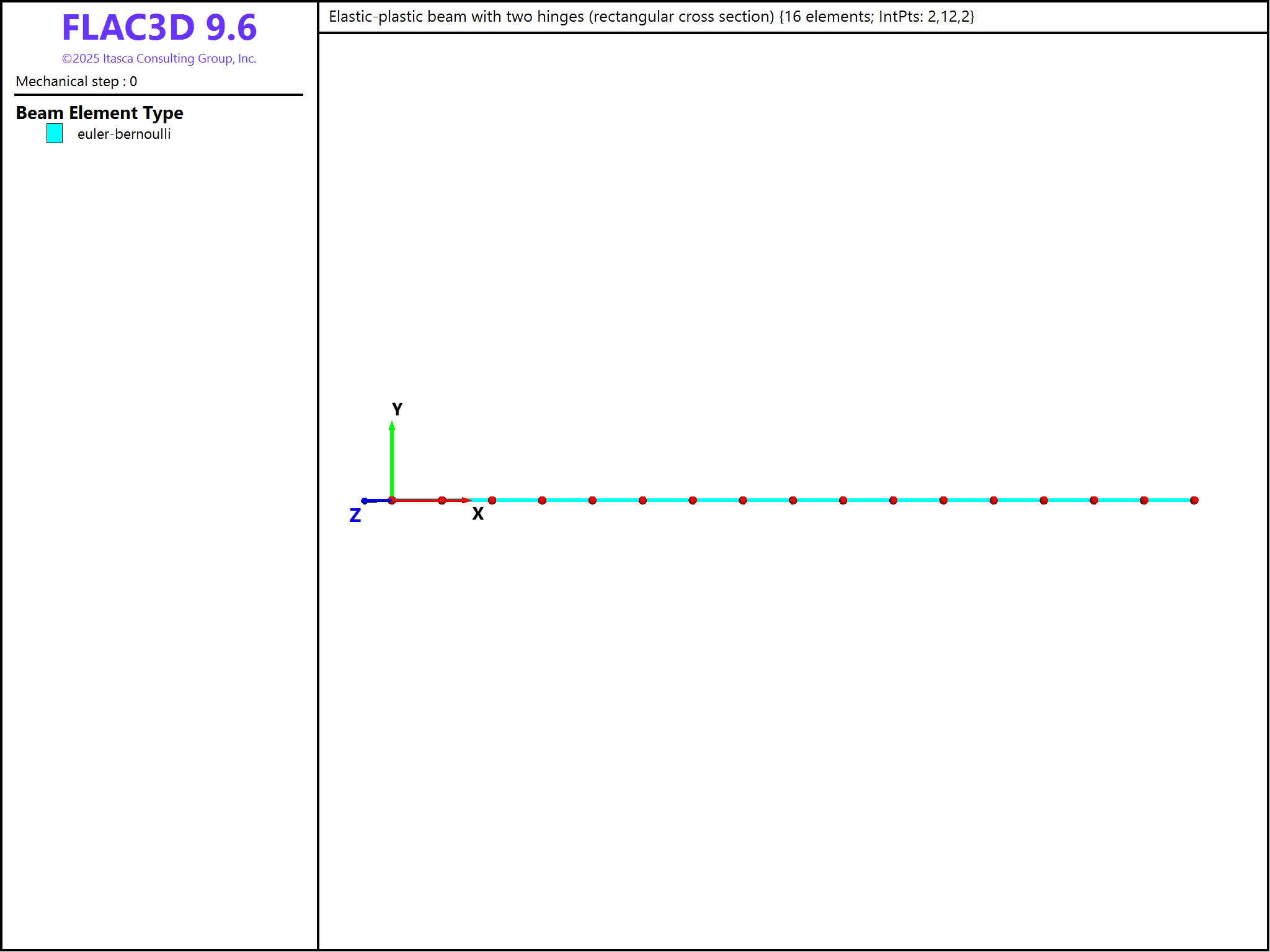 There are two projects, each in its own subdirectory. To view them in FLAC3D, use the menu command . Choose “Structure/Beam/TwoHinges” and select the desired project. The main data files used are shown at the end of this example. The remaining data files can be found in the project.