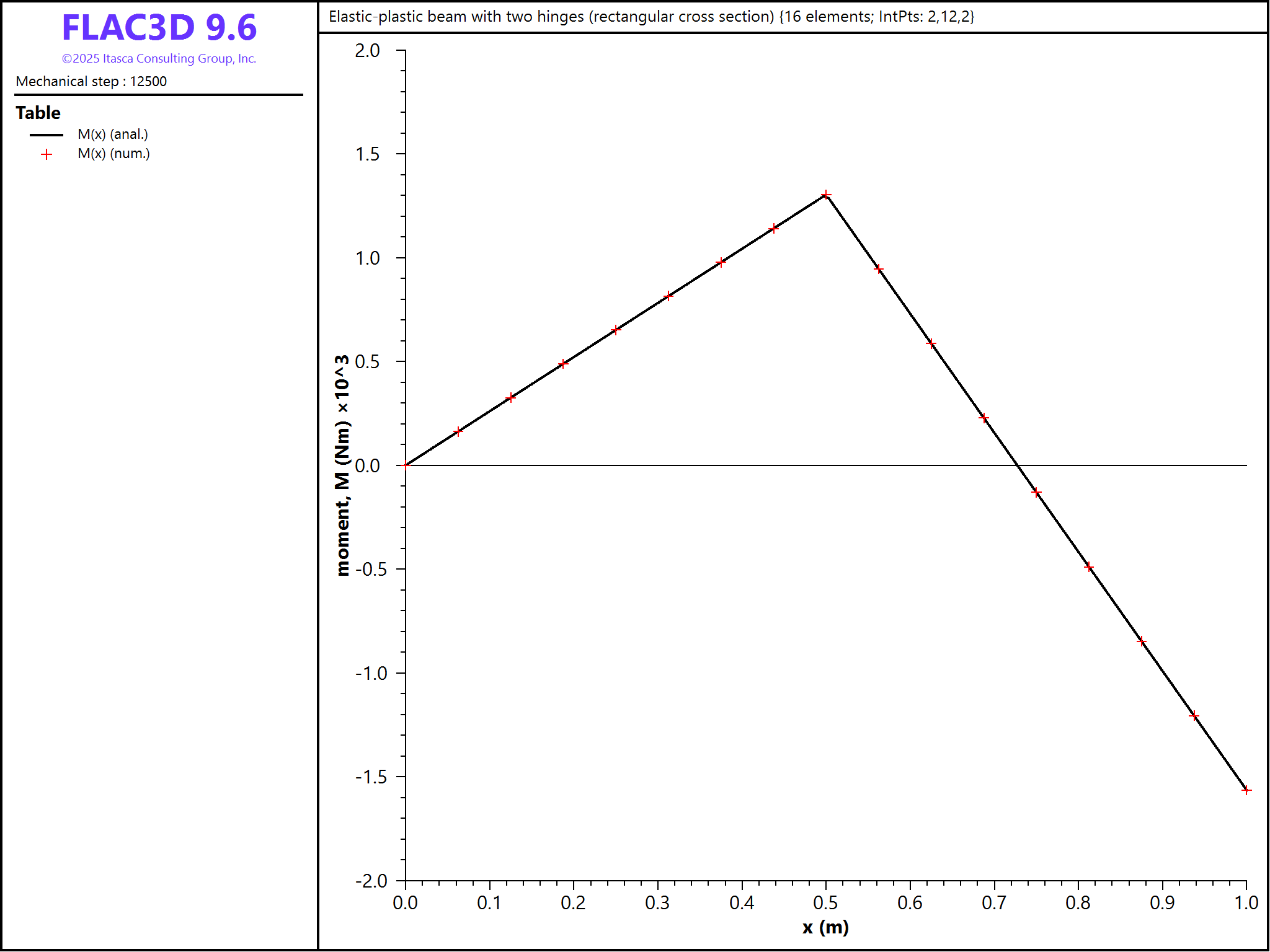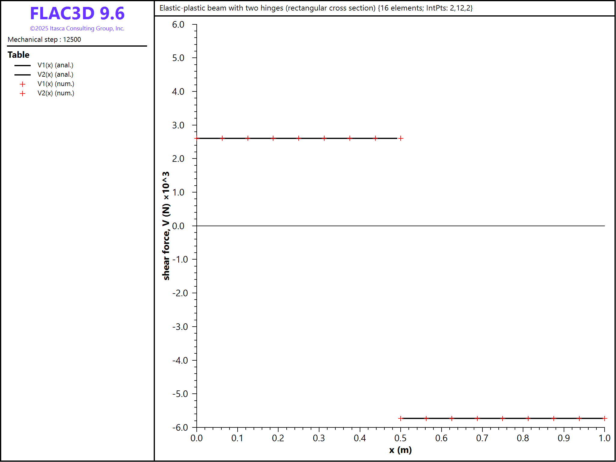 We consider a beam in which two plastic hinges form before collapse, and demonstrate how the numerical model matches: (1) the lateral deflection, shear-force and bending-moment distributions before any yielding has occurred; (2) the evolving response sketched in Figure 1 at each hinge location; and (3) the analytical collapse load.