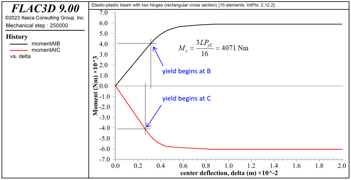 The center node is moved downwards at a velocity slow enough to maintain quasi-static conditions \((8 \times 10^{-8} \textrm{m/step})\) while measuring the applied load (as the unbalanced force acting in the \(y\) direction on the center node). Both of these quantities \((\Delta \textrm{ and } P)\) as well as the bending moments at points \(\bf B\) and \(\bf C\) are monitored as histories. The loads at which yielding begins at points \(\bf B\) and \(\bf C\) \((P_{yB} \textrm{ and } P_{yC})\) are found by checking when the outermost integration points at the left side of the element just to the right of center and the right side of the element at the right end have begun to yield. Combined damping is used with the default damping factor (see Combined Damping). The model is run in small-strain mode to correspond with the small-strain assumption of the analytical solution.