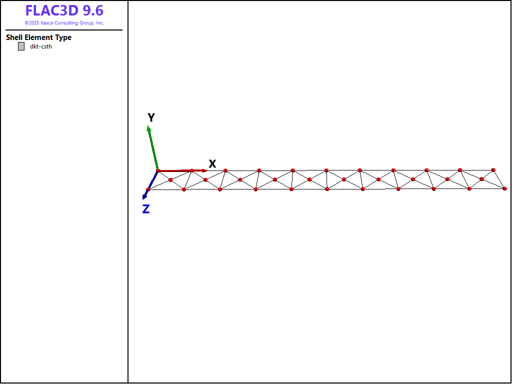 The tip deflection for a cantilever beam with a moment at its tip is computed and compared with the analytical solution for an Euler-Bernoulli beam. The problem is modeled with Euler-Bernoulli beam elements in Elastic Beam with Applied Moment. The problem is here modeled with DKT-CST Hybrid shell elements. This problem is an example of geometric nonlinearity, whereby deformations significantly alter the location of loads, so that equilibrium equations must be written with respect to the deformed geometry. Such problems can be solved by running FLAC3D in large-strain mode.