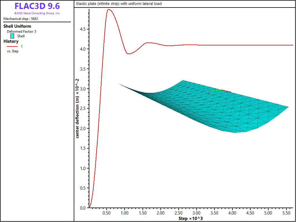 Figure 3: Deformed shape (deformation factor: 5) and center deflection.