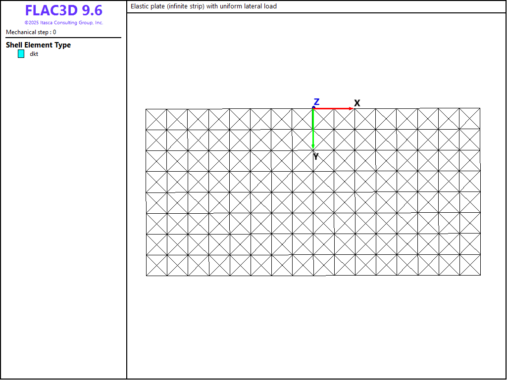 The infinite strip is modeled as a finite-sized rectangular plate of length \((a)\) and width \((b)\) using a 16 by 8 mesh of DKT elements with a cross-diagonal pattern as shown in Figure 2. The cross-diagonal pattern is used to ensure symmetric response. The simply-supported boundary condition (translational velocity fixed in the \(z\) direction) is assigned to the nodes along the \(y=0\) and \(y=b\) lines. Rigid-body motion is prevented by fixing the \(x\) and \(y\) translational of the upper-left node, and fixing the \(y\) translation of the lower-right node. The uniform lateral load is applied over the plate surface as a uniform pressure acting in the positive \(z\) direction. The \(z\)-displacement at the plate center is monitored as a history. Local nonviscous damping is used with a damping factor of 0.8. The model is run in small-strain mode to correspond with the small-strain assumption of the analytical solution. The model is cycled until a convergence limit of \(1 \times 10^{-3}\) is achieved. The model response is compared with the analytical solution along the \(x=0\) line, where the response of the finite-sized plate is like that of the infinite strip.