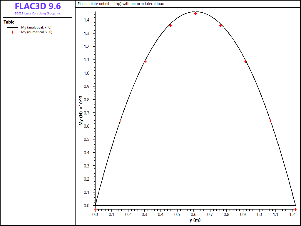 The bending along the strip length is quantified by the \(M_y\) stress resultant and shown in Figure 5. The field is constant along the length and varies from near-zero at the ends to maximum at the centerline. \(M_y\) along the \(x=0\) line is compared with the analytical solution in Figure 6. The values of \(M_y\) are obtained at the nodes along the \(x=0\) line. These values have been averaged for the shell elements that share each node. The computed values are within 0.9% of the analytical values at all sampling locations where the analytical values are not zero. The values at the ends are not zero, but will approach zero as the mesh is refined.