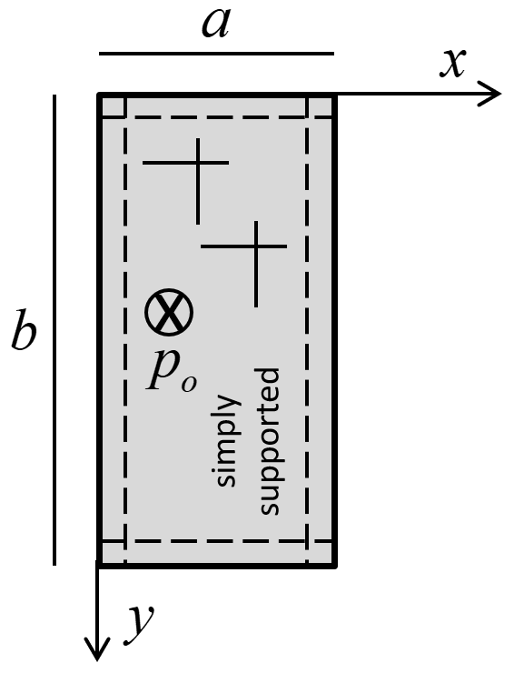 A simply supported rectangular plate (with side lengths \((a)\) and \((b)\)) is subjected to a uniform lateral load \((p_o)\). The plate has an orthotropic elastic material model. The analytical solution for lateral deflection as well as bending and transverse-shear stress resultants is given by Ugural (1981, Section 6.4). The load is resisted by bending action, and thus, the membrane stress resultants are zero. The analytical solution is expressed via the notation in Figure 1 in which the principal directions of orthotropy are aligned with the \(x\) and \(y\) axes.