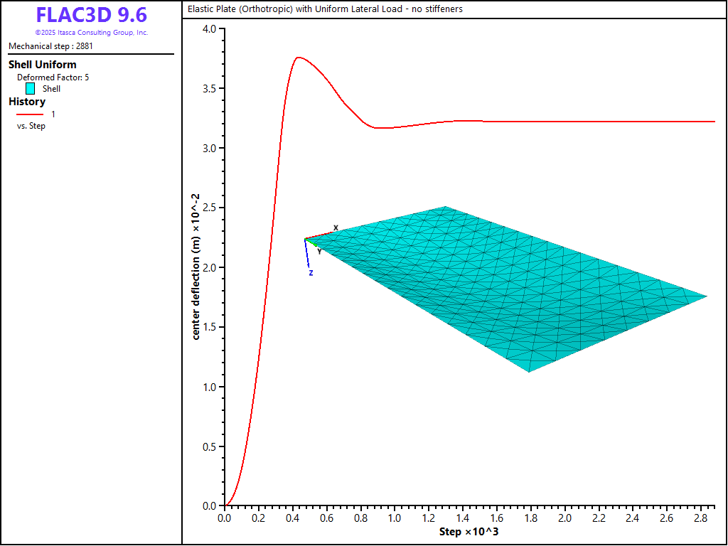 Figure 5: Deformed shape (deformation factor: 5) and center deflection (no stiffeners).
