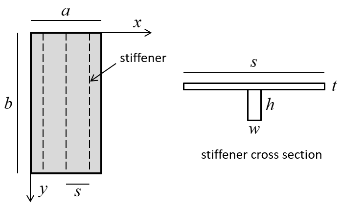The analytical solution is expressed in terms of the four rigidities: \(D_x\), \(D_y\), \(D_{xy}\) and \(G_{xy}\). For the unstiffened sheet, the rigidities are expressed in terms of \(E\) and \(\nu\) via Eq. (1). For the stiffened sheet, the rigidities are computed by constructing an orthotropic plate with elastic properties equal to the average properties of the components of the original plate. This is done using the relations for the case of a plate reinforced by a set of equidistant ribs in Ugural (1981, Table 6.1) — shown here: