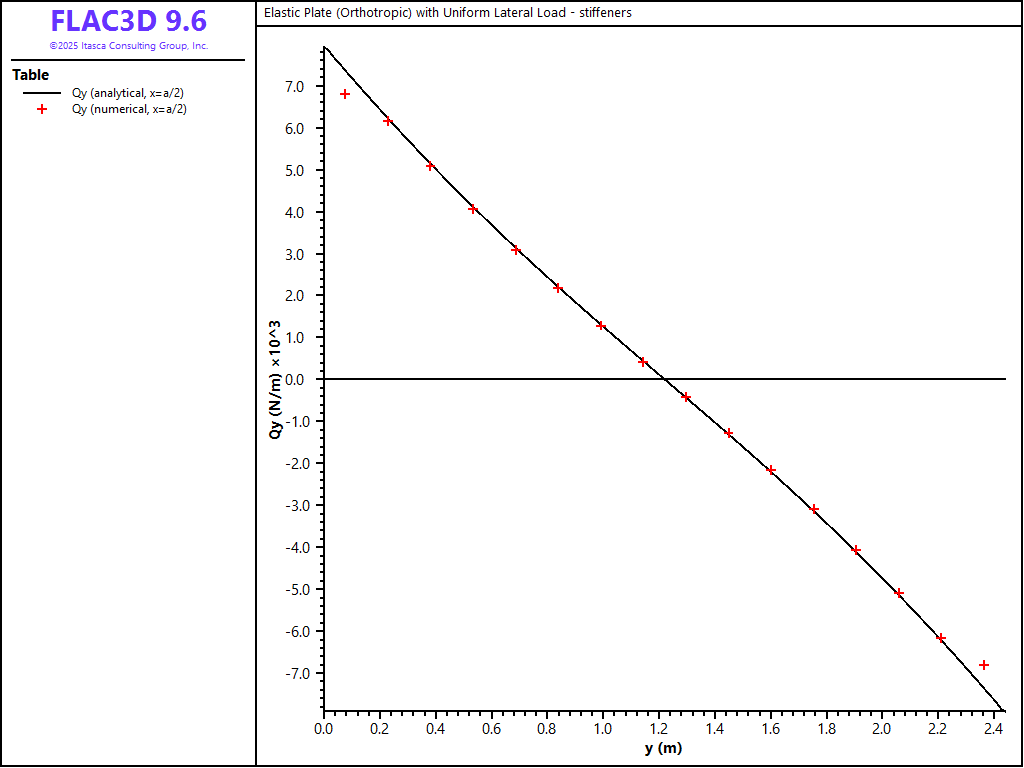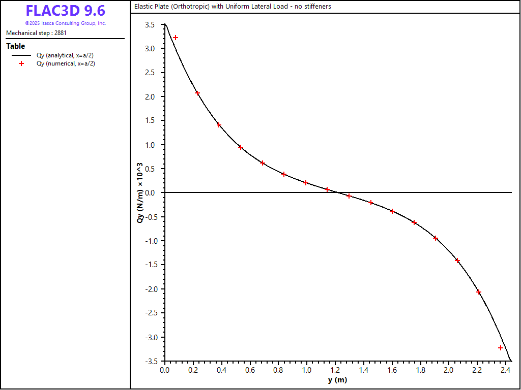 Figure 23: \(Q_y\) stress resultant along the \(x = a/2\) line (no stiffeners).