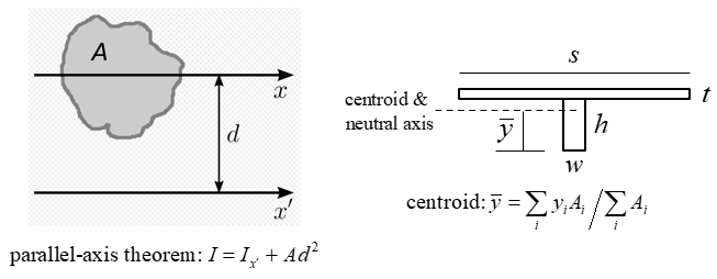 where \(G\,'_{xy}\) is torsional rigidity of the sheet; \(C\) is torsional rigidity of one rib; \(I\) is moment of inertia about neutral axis of the T-section shown in Figure 3; and \(E\) is elastic modulus of the sheet. The first three terms are obtained as follows.