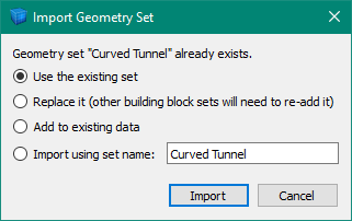 If you try to import the same file twice, you’ll see the “Import Geometry Set” dialog asking you how to resolve the situation.