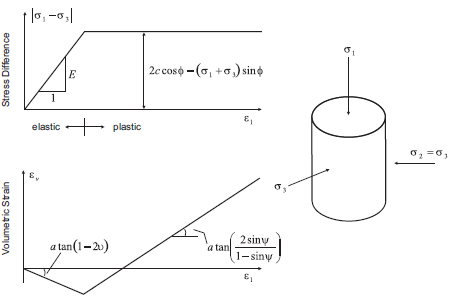 Isotropic Elastic Properties — All material models in FLAC3D, except for the transversely isotropic elastic and orthotropic elastic models, assume an isotropic material behavior in the elastic range described by two elastic constants: bulk modulus (\(K\)) and shear modulus (\(G\)). The elastic constants, \(K\) and \(G\), are preferred rather than Young’s modulus, \(E\), and Poisson’s ratio, \(ν\). While both can be used in FLAC3D, it is believed that bulk and shear moduli correspond to more fundamental aspects of material behavior than do Young’s modulus and Poisson’s ratio. (See tip 13. Use Bulk and Shear Moduli in the topic Tips and Advice for justification of using (\(K,G\)) rather than (\(E,ν\)).)