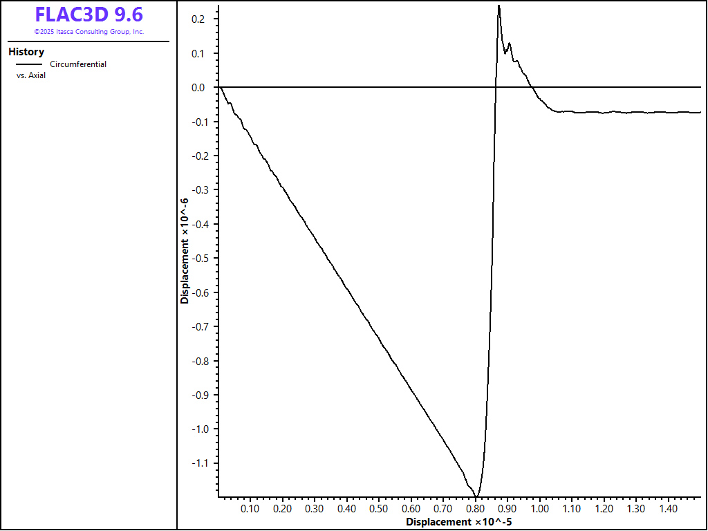Figure 6: Circumferential displacement versus axial displacement for tensile test of tension-softening material.