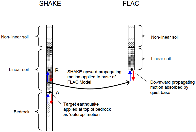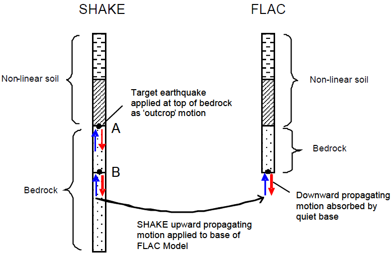 A compliant base is almost always the preferred option because downward-propagating waves are absorbed. In this case, the quiet-base condition is selected, and only the upward-propagating wave from SHAKE is used to compute the input stress history. By using the upward-propagating wave only at a quiet FLAC3D base, no assumptions need to be made about secondary waves generated by internal nonlinearities or structures within the grid, because the incoming wave is unaffected by these; the outgoing wave is absorbed by the compliant base.
