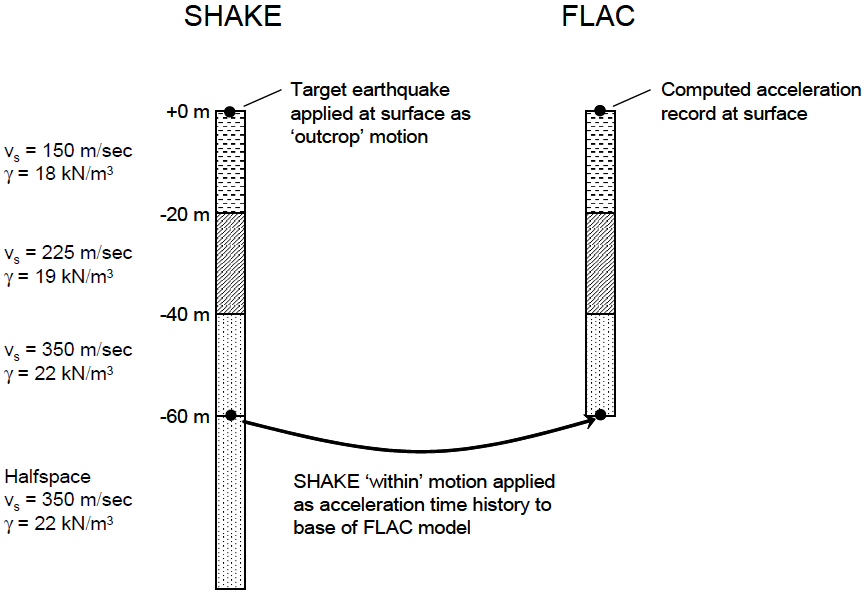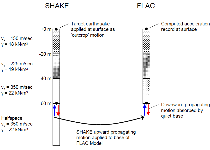 Deconvolution for a Rigid Base — The deconvolution procedure for a rigid base is illustrated in Figure 7 for a two-dimensional FLAC simulation. The same procedure also applies to FLAC3D. The goal is to determine the appropriate base input motion to FLAC such that the target design motion is recovered at the top surface of the FLAC model. The profile modeled consists of three 20-m thick elastic layers with shear wave velocities and densities as shown in the figure. The SHAKE model includes the three elastic layers and an elastic half-space with the same properties as the bottom layer. The FLAC model consists of a column of linear elastic elements. The target earthquake is input at the top of the SHAKE column as an outcrop motion. Then, the motion at the top of the half-space is extracted as a within motion and is applied as an acceleration-time history to the base of the FLAC model. Mejia and Dawson (2006) show that the resulting acceleration at the surface of the FLAC model is virtually identical to the target motion. The SHAKE within motion is appropriate for rigid-base input because, as described above, the within motion is the actual motion at that location, the superposition of the upward- and downward-propagating waves.