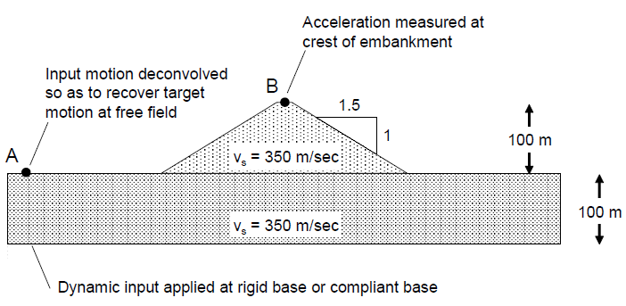 A different approach must be taken if a FLAC3D model with a rigid base is used to simulate more realistic systems (e.g., sites that exhibit strong nonlinearity, or the effect of a surface or embedded structure). In the first case, the real nonlinear response is not accounted for by SHAKE in its estimate of base motion. In the second case, secondary waves from the structure will be reflected from the rigid base, causing artificial resonance effects.
