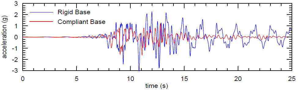 Although the presence of reflections from a rigid base is not always obvious in complex nonlinear FLAC3D analyses, they can have a major impact on analysis results, especially when cyclic-degradation or liquefaction-soil models are employed. Mejia and Dawson (2006) present examples from two-dimensional FLAC simulations that illustrate the nonphysical wave reflections calculated in models with a rigid base. One example, shown in Figure 11, demonstrates the difficulty with a rigid boundary. The nonphysical oscillations that result from a rigid base are shown by comparison to results for a compliant base in Figure 12. The inputs in both cases (rigid and compliant) were derived by deconvoluting the same surface motion.