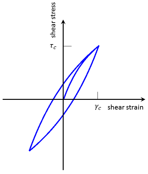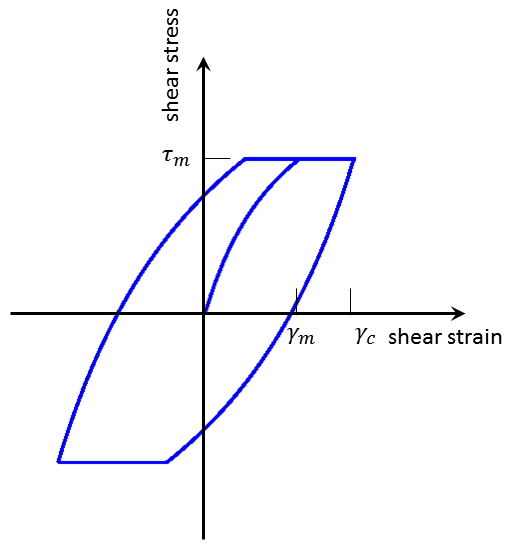 This curve is followed for primary loading. For unloading/reloading, the Masing rule holds. For the case of cyclic shear loading at constant amplitude, \(\gamma_c\), the Masing rule gives, for unloading,