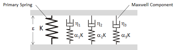 Next, we consider the full Maxwell damping scheme with three Maxwell components placed in parallel with the primary spring, as shown in Figure 6. Here the primary spring represents the elastic stiffness of the base constitutive model to which damping is to be added.
