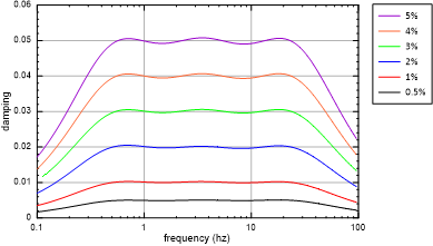 Rayleigh damping is frequency-dependent but has a “flat” region that spans about a 3:1 frequency range, as shown in Figure 1. For any particular problem, a spectral analysis of typical velocity records might produce a response such as the one shown in Figure 2.
