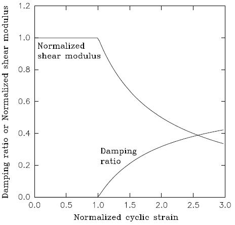 Hysteretic damping is an alternative damping option. This form of damping allows strain-dependent modulus and damping functions to be incorporated directly into the FLAC3D simulation. This makes it possible to make direct comparisons between calculations made with the equivalent-linear method and a fully nonlinear method, without making any compromises in the choice of constitutive model.