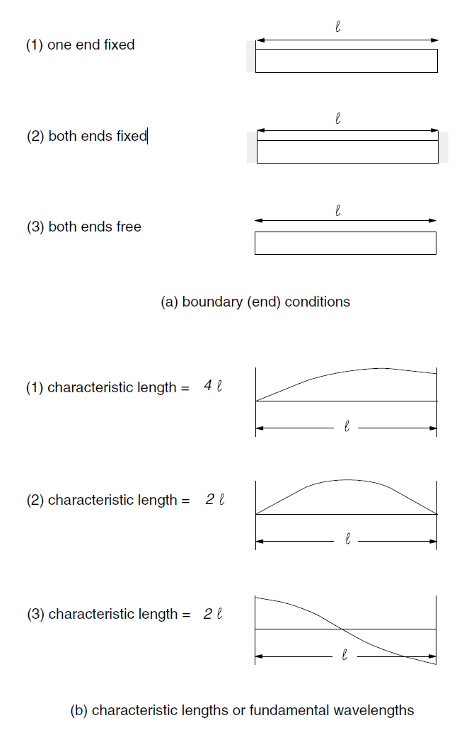The longest wavelength (or characteristic length or fundamental wavelength) depends on boundary conditions. Consider a solid bar of unit length with boundary conditions as shown in Figure 3a. The fundamental mode shapes for cases (1), (2), and (3) are as shown in Figure 3b. If a wavelength for the fundamental mode of a particular system cannot be estimated in this way, then a preliminary run may be made with zero damping (for example, see Mechanical Damping). A representative natural period may be estimated from time histories of velocity or displacement. Natural Periods of an Elastic Column contains a simple example in which natural periods are estimated by undamped simulations.