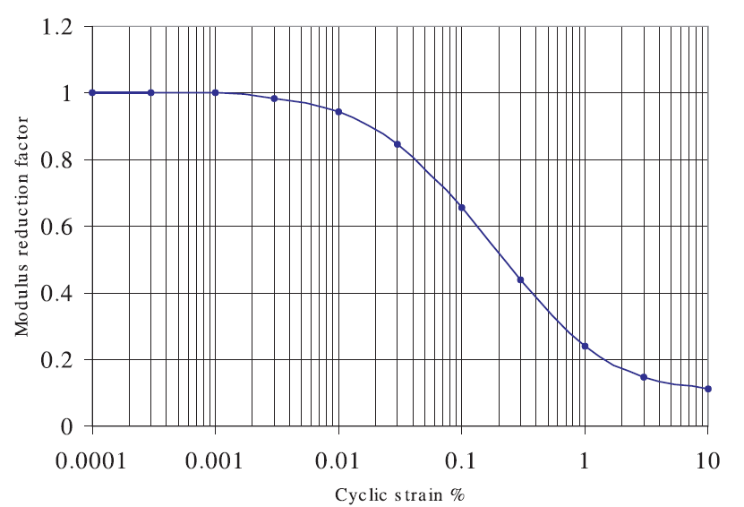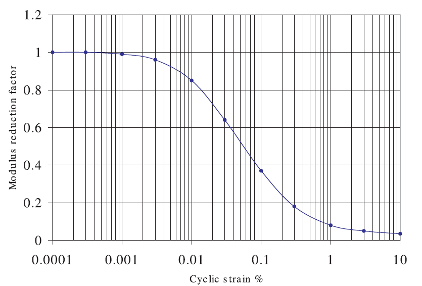 Check modulus reduction factor — Even if cyclic strains under elastic conditions are small, the use of a yield model may increase the strains. The hysteretic damping formulation is not intended to be a substitute for a yielding constitutive model. It may be used in conjunction with a yield model (such as Mohr-Coulomb), but conflicts in the domain of application should be avoided if meaningful results are to be expected.