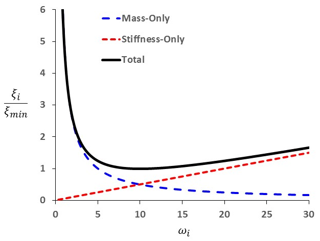 Figure 1 shows the variation of the normalized critical damping ratio with angular frequency \(\omega_i\). Three curves are given: mass components only; stiffness components only; and the sum of both components. As shown, mass-proportional damping is dominant at lower angular-frequency ranges, while stiffness-proportional damping dominates at higher angular frequencies. The curve representing the sum of both components reaches a minimum at