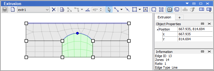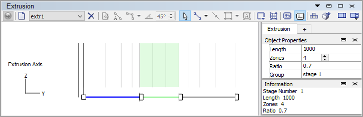 ) on the toolbar. This view is used to define the extent of the extrusion, its zoning, direction and orientation. Once these aspects have been defined and operations in the construction view are complete as well, the extrusion set may be turned into zones by pressing the extrude button (
