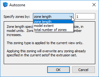 Zone size will decrease as total number of zones increases. This zoning is applied to both the extrusion view and the construction view at the same time, regardless of which is the active (visible) view. Applying this zoning will overwrite any existing zoning already specified in the extrusion set.