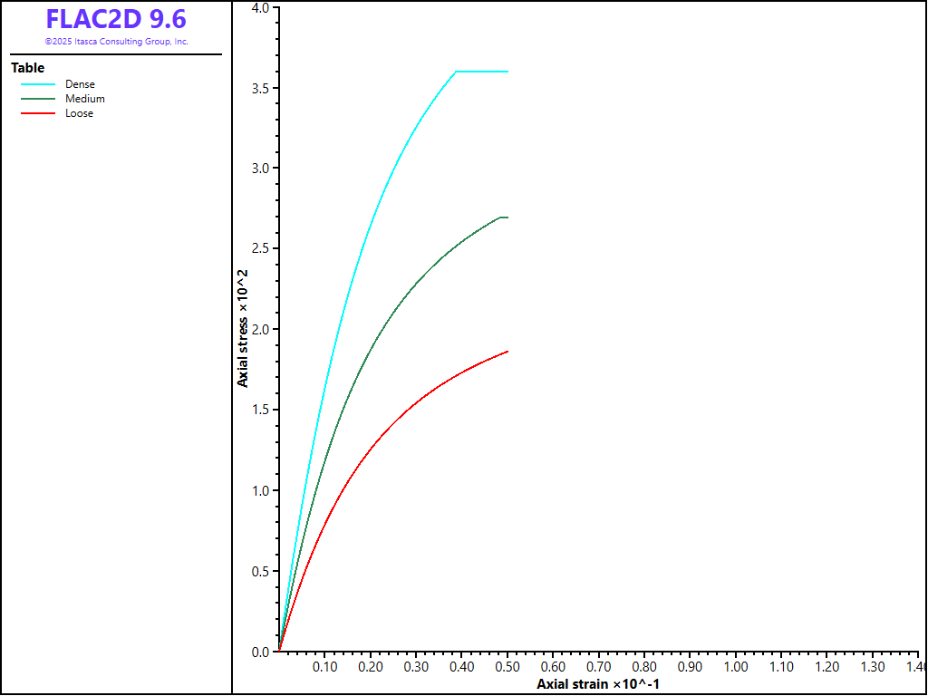 The simulations of drained triaxial test with constant dilation are repeated here by with dilation hardening, this time also using a dilation hardening law as described in the dilation hardening section of the CYSoil model. Initial dilation is zero, and the ultimate values of dilation are 10, 5, and 0 degrees for dense, medium, and loose sand, respectively. Test results for all three cases are written to table files.