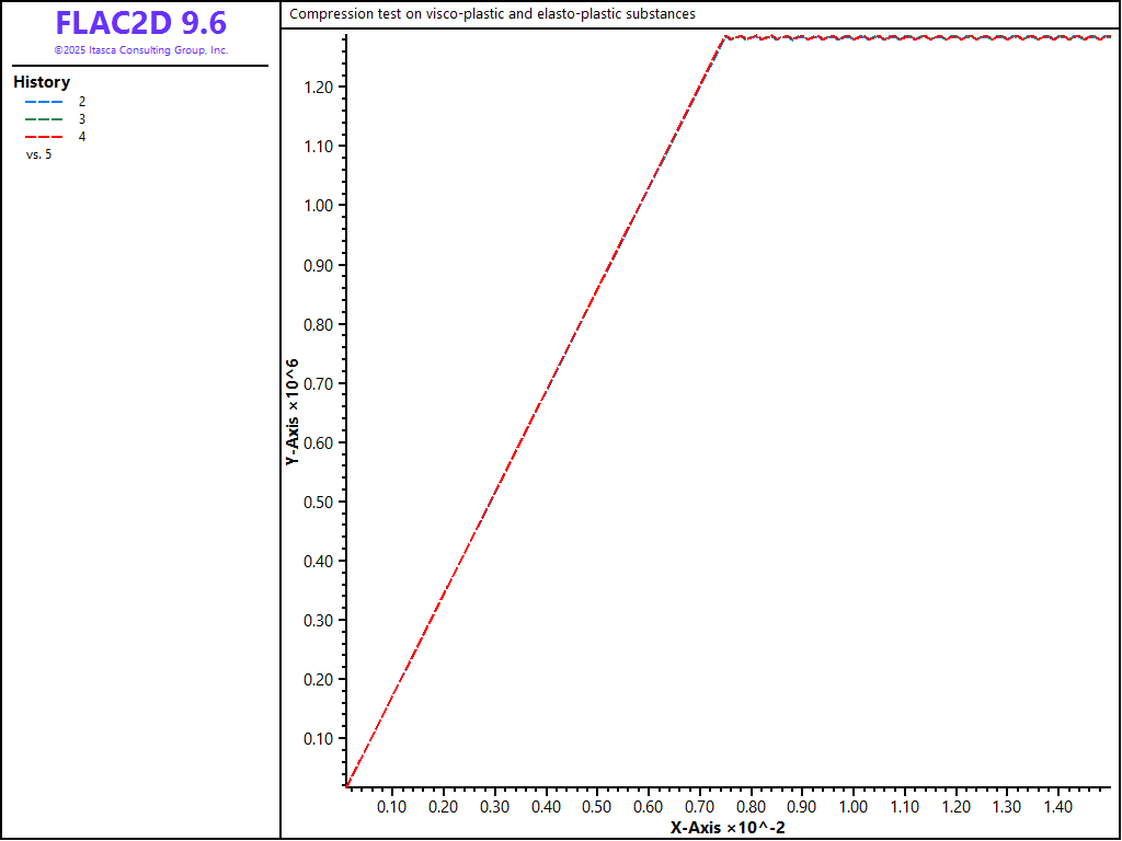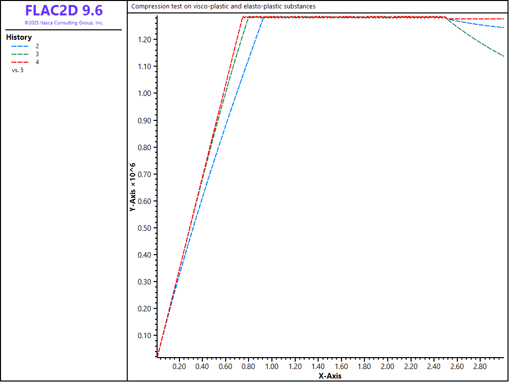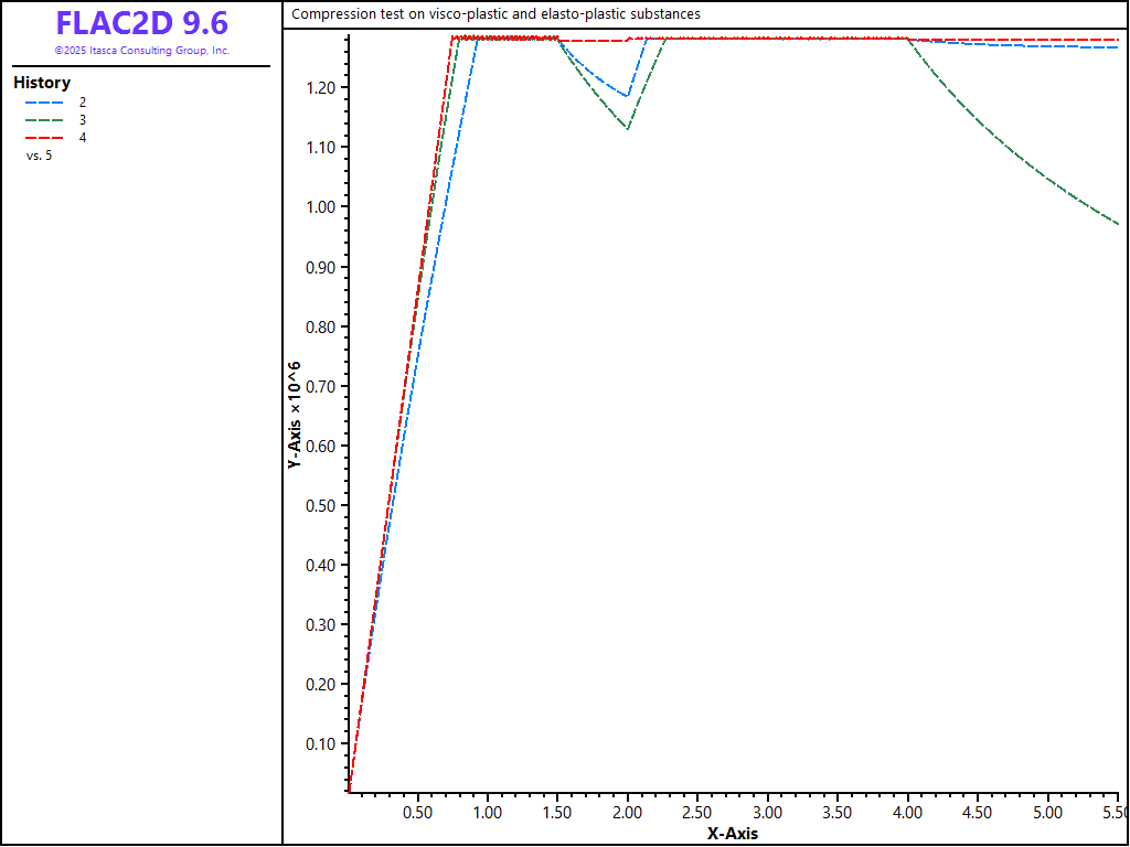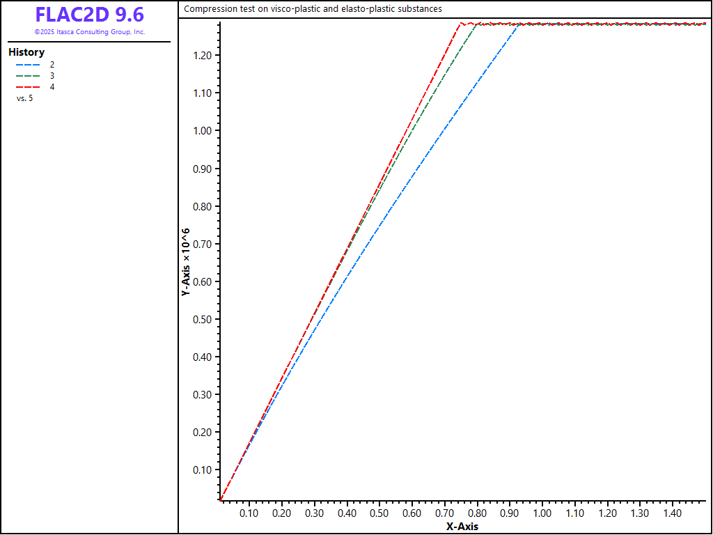 This example shows the influence of loading rate on the axial stress response of two viscoplastic samples in an unconfined compression test. The viscoelastic behavior of the first sample obeys a generalized Kelvin law; that of the second obeys a power law. Yielding is characterized by a Mohr-Coulomb failure criterion in both cases. The viscoplastic behavior is compared to that of a third sample, made of elasto-plastic Mohr-Coulomb material, and undergoing the same velocity-controlled compression test. All values quoted in this section may be interpreted in any consistent system of units, but are probably not representative, and are given only for purposes of illustration.