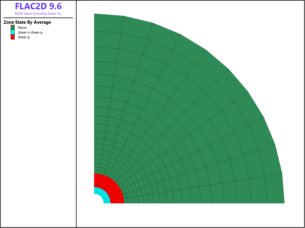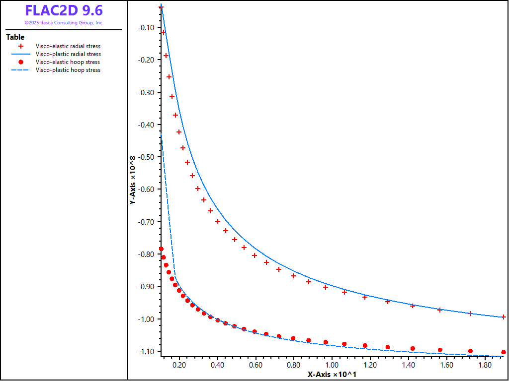 The viscoelastic analytical solution is given by the FISH function powcyl, included in the project. The results for radial and hoop stresses and plastic state at the end of the simulation are presented in Figure 1 and Figure 2. As may be observed on the plots, the region around the internal cavity is yielding, and the effect of plasticity translates in a reduction of the hoop stress magnitude in the plastic domain.