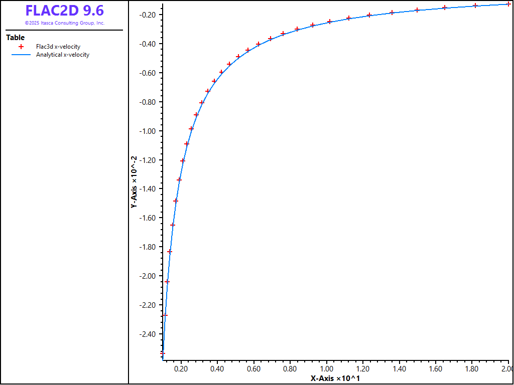 The results of this example are summarized in Figure 1 and Figure 2. Figure 1 compares the analytical solution for the radial velocity in the steady-state condition with the FLAC2D results. Figure 2 shows the comparison of radial and hoop stresses. The agreement between results is similar to that for the power law test in Power Model: Cylindrical Cavity.