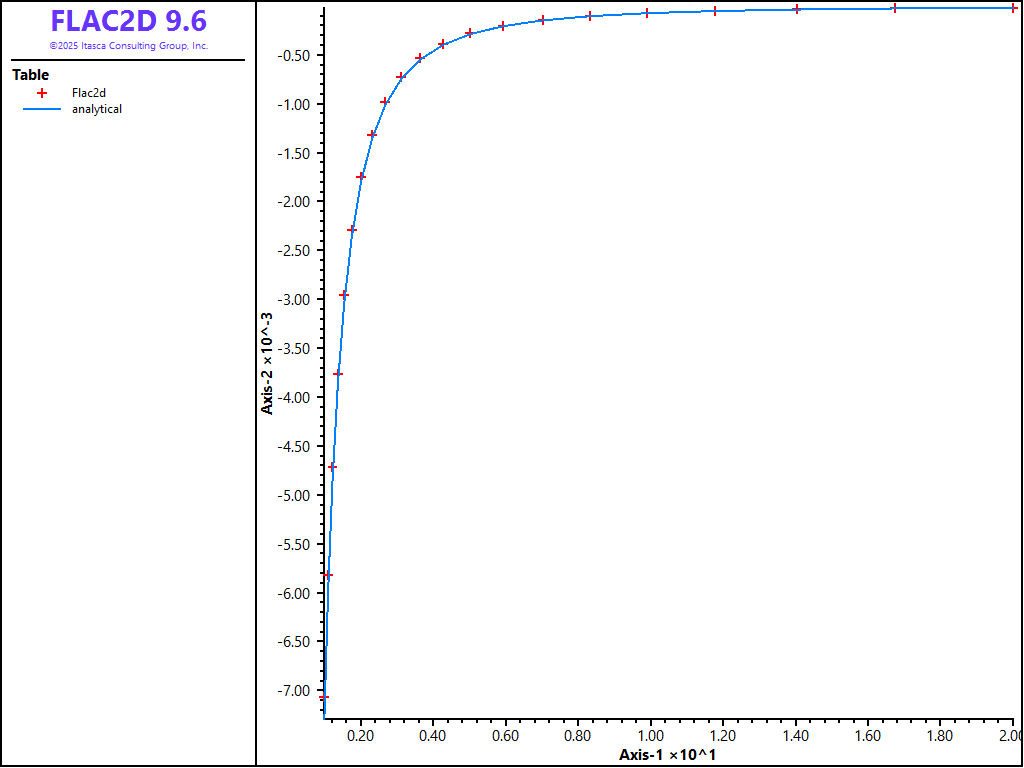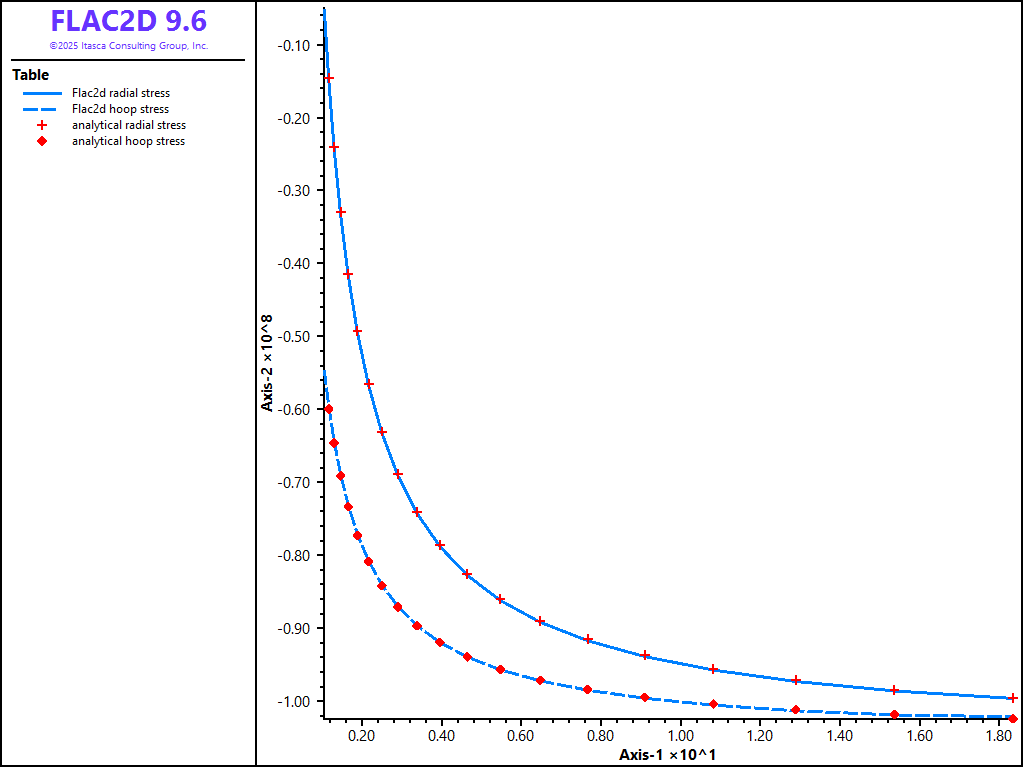 The results are summarized in Figure 2 through Figure 5. Figure 2 and Figure 3 compare the radial velocity and radial and hoop stresses obtained with FLAC2D with the analytical values.