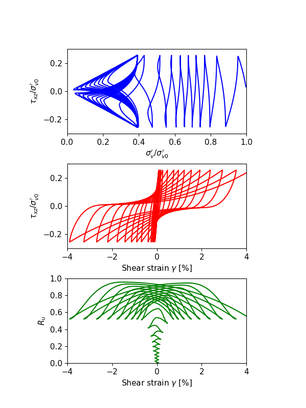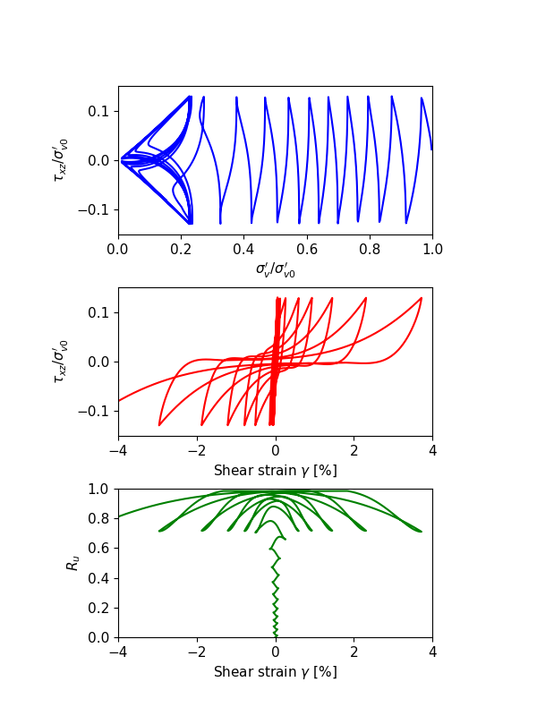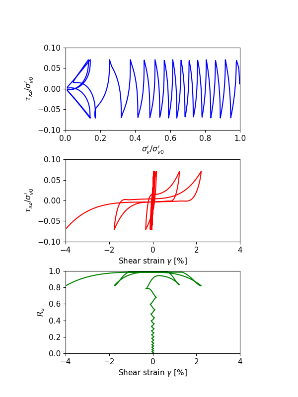 All parameters are with the default parameters except the initial relative densities are different. Pore-pressure in the zone is allowed for building-up. The out-of-plane (alone y-axis) strains are restricted. The degrees-of freedom at the zone top are attached so that all grid points at the top have the same displacements to satisfy the DSS conditions. The gridpoints at the zone top are velocity-controlled. Once the shear stress (\(\tau\)) amplitude reaches a certain value (\(CSR \times \sigma^{\prime}_{v0}\)), the velocities of gridpoints at the zone top will be reverted. In this example, the parameter study is performed by a Python-based master file.