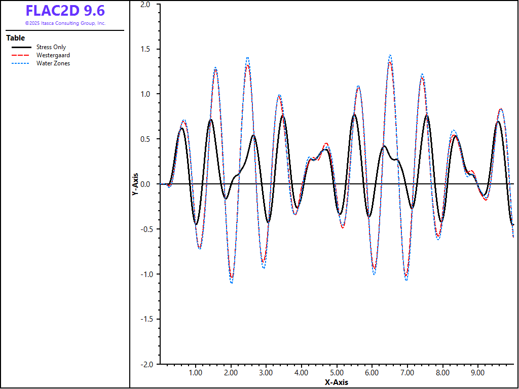 The dynamic loading is a velocity sine wave applied to the base of the model. The models are first brought to a static equilibrium state with the reservoir loading applied along the upstream vertical face of the dam. The dynamic loading is then applied for a period of 10 seconds. The horizontal displacement at the top of the dam at the upstream face is monitored for all three cases. The results are plotted for comparison in Figure 3.