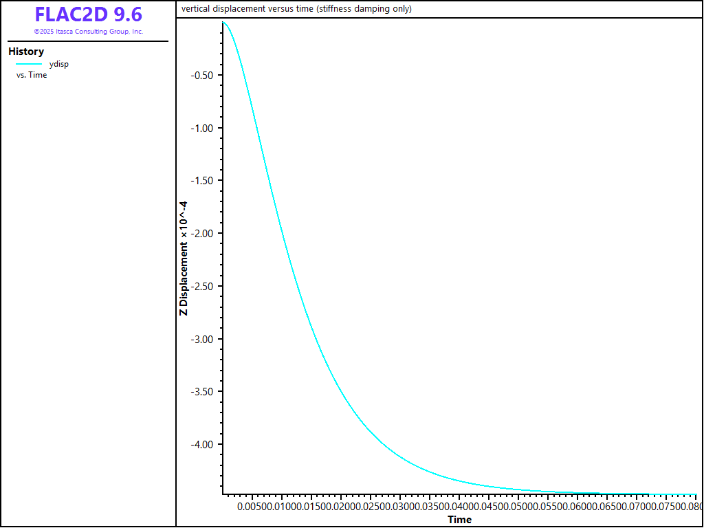 Figure 4: Plot of vertical displacement versus time for gravity suddenly applied to a square grid (stiffness damping only).