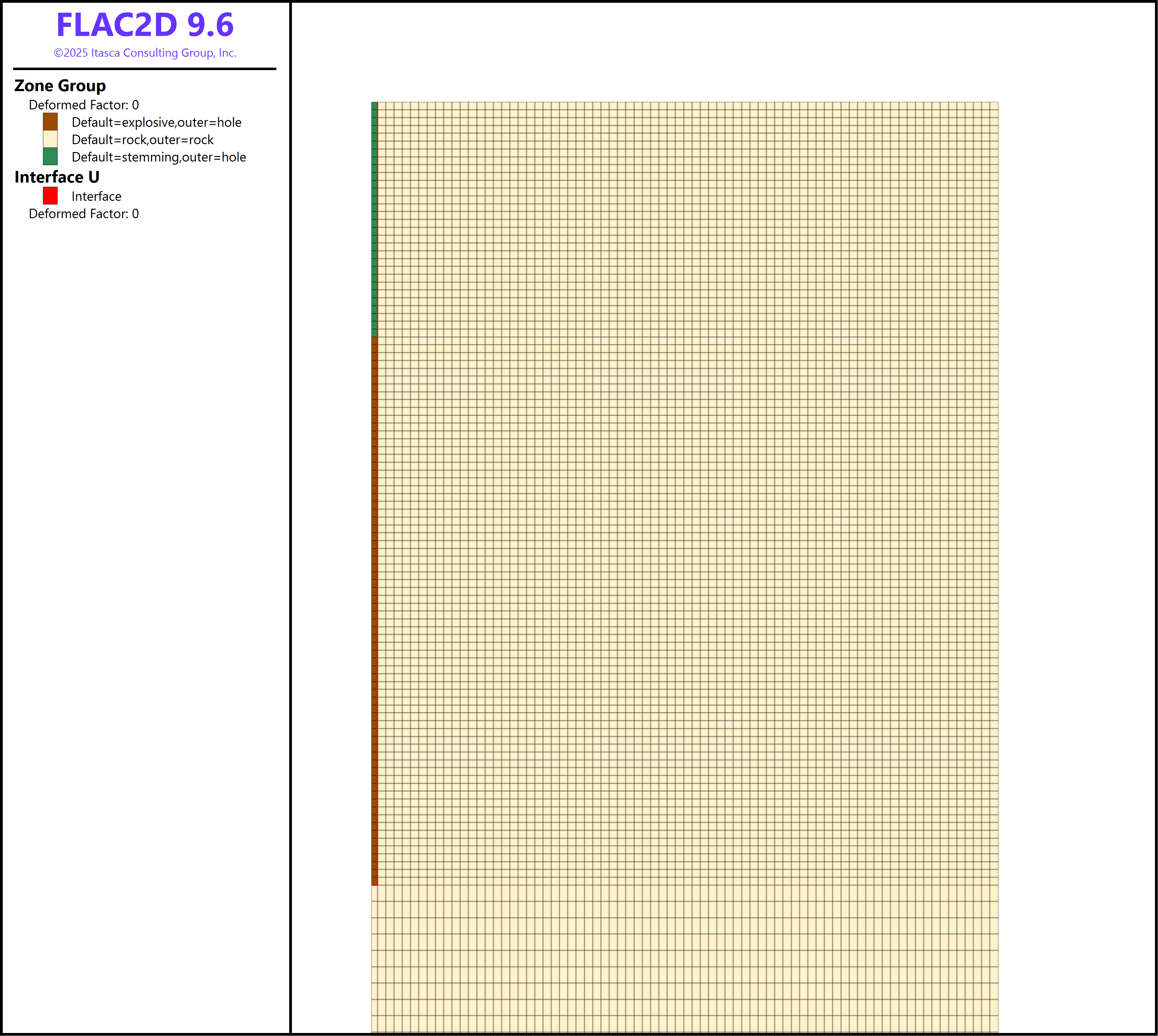 This example demonstrates the programmed burn algorithm in a 2D axisymmetric model, capturing a slice of the cylindrical geometry (Figure 1). The model extends vertically from below the bottom of the borehole to the ground surface. The borehole is explicitly modeled with a radius of 7.5 cm and represented by several zones in the vertical direction (single zone in radial direction). The borehole consists of explosive and stemming. The surrounding rock is modeled out to a radius of 8 m to capture the explosive-rock interaction. Between the borehole and the surrounding rock, an interface is used with zero shear stiffness and zero strength to allow for vertical expansion of the explosive zones, i.e., the upward flow of detonation reaction product gases. Stemming zones that are ejected upward past the top of the model are nulled with the FLAC2D command zone null.