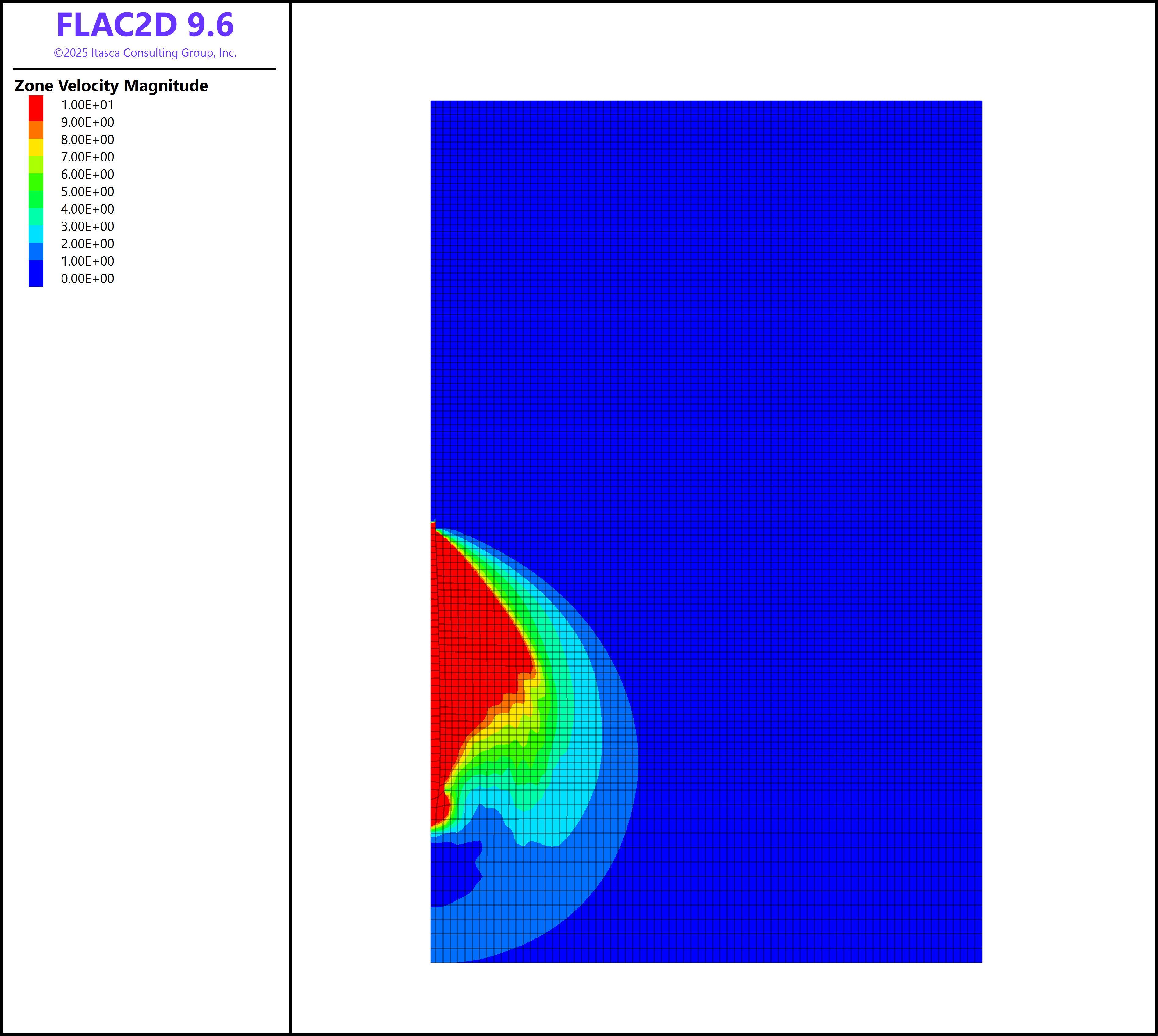 Peak particle velocity (PPV) is the maximum velocity vector magnitude seen at a given location during a blast. This is often used as a metric for damage and fragmentation. A Python function tracks the PPV at each gridpoint and there is a function to interpolate these values onto the zone centroids. Figure 4 shows the PPV at the end of the model run. There is a region of high PPV around the explosive which decreases with radial distance away, there is an amplification effect due to reflection at the free surface. PPV can be a proxy for local fragmentation size and rock damage.