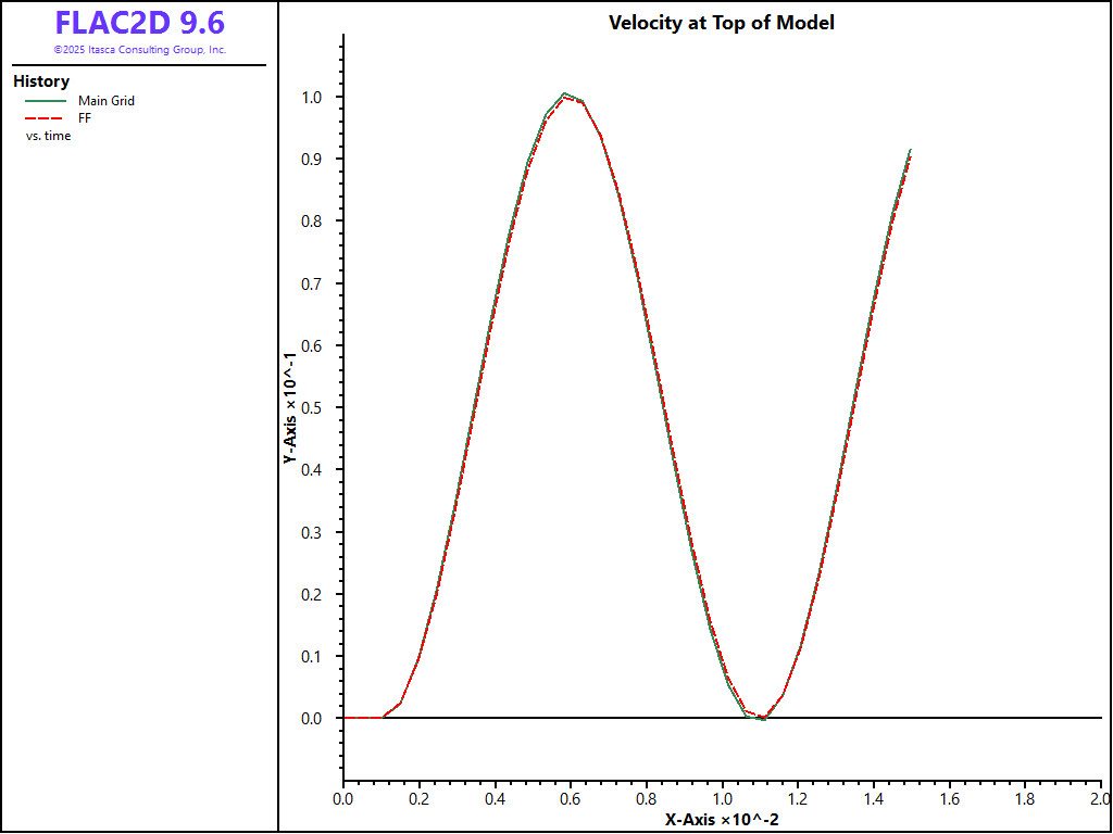 A shear stress wave is applied to the base of the model. Figure 2 shows the resulting \(x\)-velocity at the top of the model at different points in both the free field and the main grid.